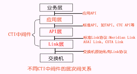根據(jù)CTI的功能定位,我們可以把CTI產(chǎn)品劃分為不同的層次,一般地可分為三種類型:Link層產(chǎn)品、API層產(chǎn)品、應(yīng)用層產(chǎn)品,其分層結(jié)構(gòu)示意圖如下所示: