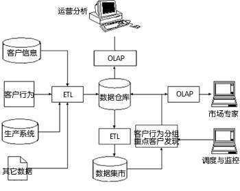數(shù)據(jù)主要有四個方面的來源:客戶信息、客戶行為、生產(chǎn)系統(tǒng)和其它相關數(shù)據(jù)。這些數(shù)據(jù)通過抽取、轉(zhuǎn)換和裝載過程,形成數(shù)據(jù)倉庫,并通過OLAP和報表,將客戶的整體行為分析和企業(yè)運營分析等傳遞給數(shù)據(jù)倉庫用戶。