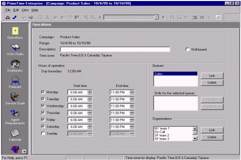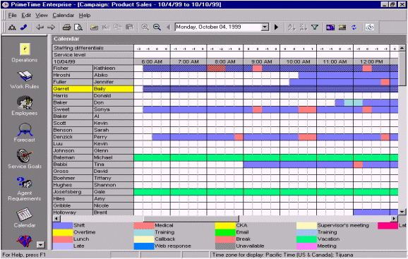 絕大多數(shù)的WFMS可以通過歷史數(shù)據(jù)和人員情況自動生成排班表。而且它也只是簡單的根據(jù)呼叫中心的運營時間來排班。舉個例子,某個呼叫中心在排班是有兩個班,一個工作時間是早7點到下午3點,另一個是早九點到晚五點,這就意味著不僅要安排早、晚休息,還要顧及到午休的時間。休息的安排要保證能夠在電話的持續(xù)中也能有持續(xù)的人員保證電話量。在這個自動化軟件的之中還有一個因素要能夠實現(xiàn)自動化--人的因素。例如:Mary和Jane想同時去吃午餐,然而自動化的排班表并不是這樣的。然而主管根據(jù)當時的話務量情況和工作狀況以及工作規(guī)范批準了Mary和Jane共享午餐的要求,而WFMS就要能夠處理這樣很有可能發(fā)生,而且是合理的情況。排班表的更改應該就是簡單的拖拽圖標就應該能夠實現(xiàn)的功能,并且能夠在這種更改會對預測的話務量差生不好影響時,拒絕這種拖拽行為。
