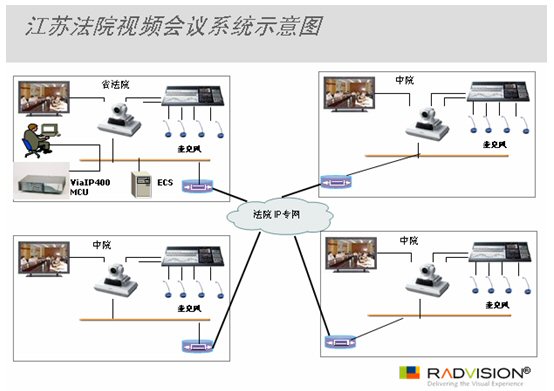 RADVISION為江蘇法院建立的視頻會(huì)議系統(tǒng)解決方案配備1臺(tái)RADVISION ViaIP400 MCU,建設(shè)容量為13點(diǎn)的2M會(huì)議,系統(tǒng)支持不同需求的會(huì)議模式,包括研討型會(huì)議、遠(yuǎn)程法庭、遠(yuǎn)程審判、大型講演型會(huì)議和培訓(xùn)等,會(huì)議資源由江蘇法院集中控制和調(diào)度。在安全性、技術(shù)先進(jìn)性、可擴(kuò)展性、易操作性和經(jīng)濟(jì)性等方面,RADVISION視頻會(huì)議系統(tǒng)都做了充分的考量。