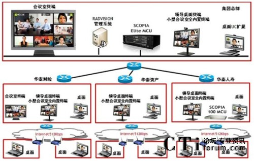 隨著業(yè)務的不斷擴大,華泰保險經(jīng)紀有限公司需要不斷加快信息交流的速度,以確保信息交流的暢通。華泰保險經(jīng)紀有限公司希望能夠通過現(xiàn)有網(wǎng)絡,利用先進的通信傳輸技術(shù),組建整個集團公司的視頻會議系統(tǒng),并能保證視頻會議系統(tǒng)的正常、穩(wěn)定運行。同時,華泰保險的領導希望能夠充分利用已經(jīng)建成的公司網(wǎng)絡資源,將各地營業(yè)部連接在一起,用于召開不同規(guī)模、各種形式的行政會議和業(yè)務會議、業(yè)務培訓,以達到提高工作效率、節(jié)省差旅成本、加強總部對各個分支機構(gòu)管理的目的。從而真正增強企業(yè)的競爭力,推動企業(yè)信息化建設的發(fā)展。