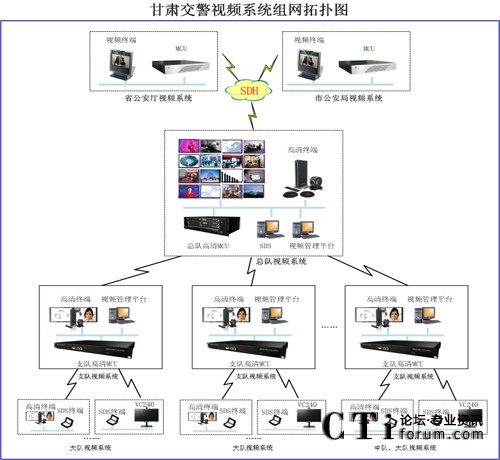 本次建設(shè)的交警總隊視頻會議系統(tǒng),包含覆蓋全省交警總隊、多個支隊、大隊、中隊的大型視頻會議網(wǎng)絡(luò)。其中包含了2個總隊會場16個支隊、100個大隊與16個中隊。交警總隊、支隊、大(中)隊與省公安廳、市州公安局通過SDH專線進(jìn)行交互訪問,支隊與市州公安局、大隊與區(qū)縣公安局、總隊到各支隊的網(wǎng)絡(luò)均為專線聯(lián)接。