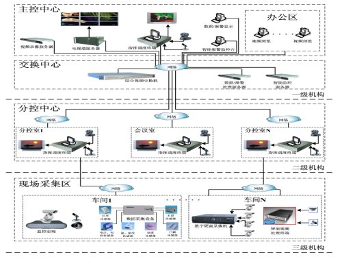 圖 4是一個(gè)典型的電力企業(yè)綜合視頻指揮調(diào)度系統(tǒng)網(wǎng)絡(luò)拓?fù)鋱D,在地理上可分一級機(jī)構(gòu)(主控中心操作顯示區(qū)、信息控制交換處理區(qū))、二級機(jī)構(gòu)(分控中心操作區(qū))、三級機(jī)構(gòu)(現(xiàn)場音視頻、數(shù)據(jù)、智能監(jiān)控點(diǎn)采集區(qū))。