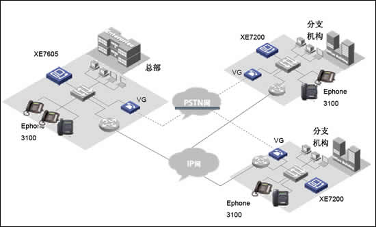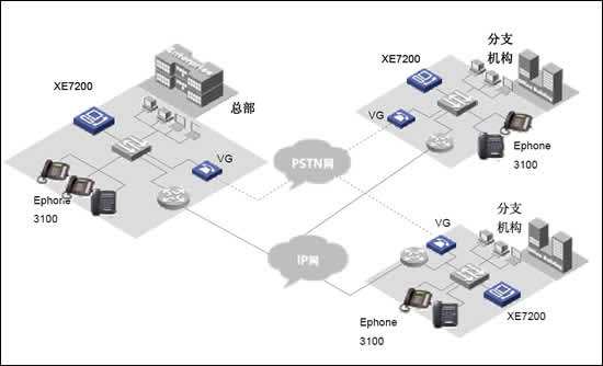 當(dāng)企業(yè)存在多個大型分部的時候,如一個國際性公司。則可以在各個分部部署XE7000冗余方案,每個分部維護獨立的本地用戶信息。各小分支機構(gòu)的IP語音終端可以直接注冊到本地XE7000上,從而實現(xiàn)整網(wǎng)的分布式部署。