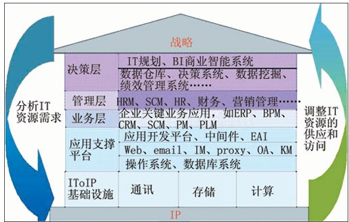 按照華為3Com的構(gòu)想,如果把整個IT系統(tǒng)比做一座房屋,那么整個房屋的地基就是IP網(wǎng)絡(luò),需要基于IP網(wǎng)絡(luò)來構(gòu)建通信、存儲、計算等IT基礎(chǔ)設(shè)施。在這些基礎(chǔ)設(shè)施之上,則是應用支撐平臺(操作系統(tǒng)、數(shù)據(jù)庫系統(tǒng)、應用開發(fā)平臺等),基于應用支撐平臺提供給機構(gòu)的關(guān)鍵業(yè)務(wù)流程信息系統(tǒng)(如ERP、SCM等),最終為用戶的管理和決策提供支持!霸趹(zhàn)略與IT基礎(chǔ)設(shè)施之間實現(xiàn)實時同步互動,IT為用戶高層提供商業(yè)智能系統(tǒng)、決策系統(tǒng),以便決策層即時掌握信息,作為機構(gòu)戰(zhàn)略決策、戰(zhàn)略挑戰(zhàn)的依據(jù);用戶可以依據(jù)內(nèi)、外部變化,進行戰(zhàn)略調(diào)整時快速分析新的IT資源需求,同步調(diào)整IT資源的配置,從而使IT與業(yè)務(wù)戰(zhàn)略保持同步!边@正是IToIP的基本理念。