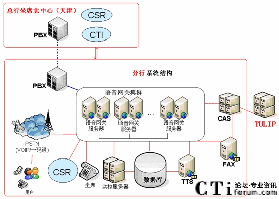 對(duì)于山東省分行連接總行呼叫中心北中心心的情況,農(nóng)業(yè)銀行對(duì)系統(tǒng)的總體結(jié)構(gòu)已經(jīng)做了比較詳細(xì)的規(guī)劃,異地坐席中心的系統(tǒng)結(jié)構(gòu)圖如下: