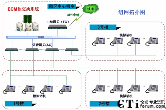 基地先完成機房到桌面的弱電布線,在大樓中心骨干機房,架設(shè)一套ECM軟交換系統(tǒng)組建電話通訊網(wǎng)絡(luò)。
