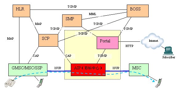 例如華為移動(dòng)智能網(wǎng)彩鈴方案的主要流程包括呼叫流程和管理流程,屬于主叫端局觸發(fā)方式。在主叫端局的被叫流程中通過(guò)SCP下發(fā)帶有路由前綴的Connect信令把呼叫轉(zhuǎn)移到AIP(彩鈴中心),AIP橋接呼叫到被叫端局,個(gè)性化鈴音在被叫端局發(fā)送ACM之后屏蔽普通鈴音,向主叫端局播放被叫定制的彩鈴音。管理流程需要AIP、SCP和MSC的配合,主叫用戶撥打彩鈴管理流程接入碼觸發(fā)到SCP,SCP判斷帳戶權(quán)限通過(guò)后,下發(fā)ETC信令,讓MSC和AIP建立臨時(shí)連接,由AIP進(jìn)行管理流程的操作。系統(tǒng)結(jié)構(gòu)圖如圖2所示,這種方式屬于"有迂回"方式。