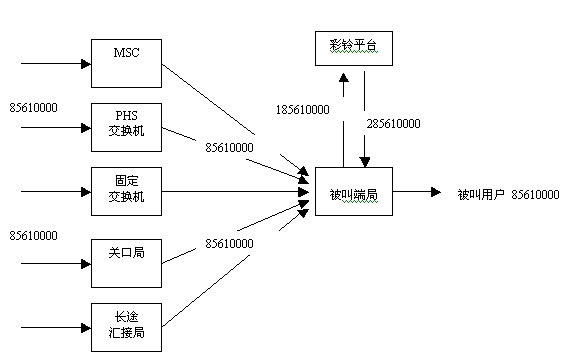 - 當(dāng)主叫呼叫彩鈴業(yè)務(wù)用戶歸屬的交換機(jī)時(shí)時(shí),被叫交換機(jī)判斷這個(gè)用戶有"彩鈴屬性"標(biāo)志,并不馬上接通業(yè)務(wù)用戶(被叫),而是在被叫號(hào)碼前面加上一個(gè)彩鈴平臺(tái)的號(hào)碼前綴,這樣被叫號(hào)碼成了"前綴1+原被叫號(hào)碼",然后被叫交換機(jī)把這個(gè)新被叫號(hào)碼接續(xù)到彩鈴平臺(tái);