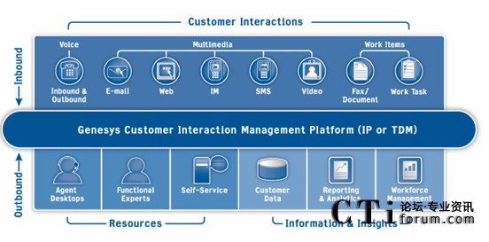 Genesys Customer Interatcion Management Platform是一個開放、可擴充、有彈性的客戶管理交互平臺。它是建構(gòu)客服中心的核心 ,所有Genesys解決方案模塊 ,包含企業(yè)智能路由(Enterprise Routing Solution)、智能網(wǎng)端智能路由(Network Routing Solution)、外撥解決方案(Outbound Contact Solution)、互聯(lián)網(wǎng)解決方案(Internet Contact Solution)、勞動力管理方案(Workforce Management Solution)等等都是建構(gòu)在Genesys的基礎平臺之上。使得Genesys所有的模塊都可充份整合在一起 ,提供客戶全方位、全功能的企業(yè)交互解決方案。