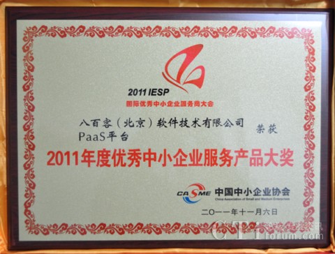 作為國內(nèi)首家SaaS廠商,八百客積極推動(dòng)云計(jì)算在中小企業(yè)中的宣傳與運(yùn)用。2006年,八百客在國內(nèi)率先推出管理自動(dòng)化開發(fā)平臺800APP, 它擴(kuò)展了按需服務(wù),并實(shí)現(xiàn)了客戶可根據(jù)需要自定制應(yīng)用程序,成為了改變應(yīng)用程序開發(fā)的一個(gè)新途徑。為表彰八百客在中小企業(yè)信息化中做出的杰出貢獻(xiàn),本次大會(huì)特別為八百客頒發(fā)了“2011年度優(yōu)秀中小企業(yè)服務(wù)產(chǎn)品大獎(jiǎng)”,此外還授予八百客總經(jīng)理李智 “2011年度優(yōu)秀中小企業(yè)服務(wù)明星大獎(jiǎng)”。