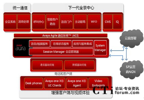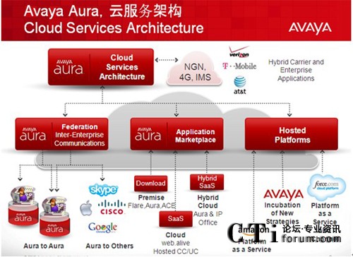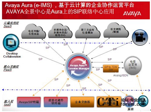 - 當其他廠商還在爭論公有云和私有云的優(yōu)劣時,Avaya已經(jīng)開始部署企業(yè)的私有云—Avaya Aura 和運營商的公有云之間如何和諧共處;企業(yè)用戶的統(tǒng)一通信功能完全基于”按需服務(wù)激活”模式;