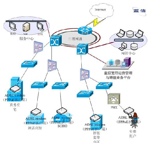 在以以太網(wǎng)技術(shù)為主建設(shè)的運(yùn)營區(qū)域,在中心由一臺(tái)模塊化的核心交換機(jī)支持,輔以多臺(tái)BASE設(shè)備連接,在接入層用交換機(jī)做接入設(shè)備,保證用戶數(shù)據(jù)的快速傳播。在網(wǎng)絡(luò)核心處,部署信利公司的藍(lán)信寬帶認(rèn)證計(jì)費(fèi)系統(tǒng),負(fù)責(zé)對(duì)全網(wǎng)用戶的安全認(rèn)證、計(jì)費(fèi)及管理。藍(lán)信寬帶認(rèn)證計(jì)費(fèi)系統(tǒng)除支持標(biāo)準(zhǔn)的RADIUS協(xié)議外,還支持PPPoE、802.1x認(rèn)證。在用戶終端處,部署藍(lán)信特制的PPPoE客戶端,實(shí)現(xiàn)撥號(hào)上網(wǎng)。
