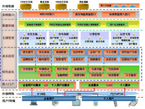 功能上分為企業(yè)門(mén)戶(hù)與個(gè)人門(mén)戶(hù)。企業(yè)門(mén)戶(hù)可以通過(guò)話(huà)務(wù)員服務(wù)以及企業(yè)網(wǎng)上自服務(wù)提供號(hào)碼百事通的業(yè)務(wù)受理等功能;個(gè)人門(mén)戶(hù)同樣可以通過(guò)話(huà)務(wù)員及個(gè)人網(wǎng)上自服務(wù)功能提供號(hào)碼百事通所有的業(yè)務(wù)。
