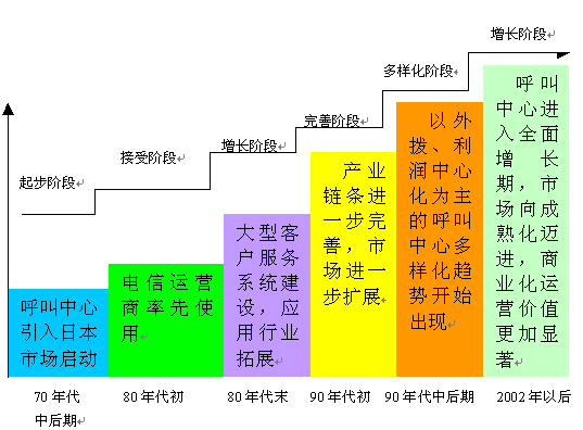 日本市場是全球較為成熟的呼叫中心市場之一,呼叫中心的應(yīng)用遍布各行各業(yè)。在整體呼叫中心行業(yè)產(chǎn)生的市場價值中,由呼叫中心外撥直接產(chǎn)生的占1/4強,50%的呼叫中心配備了專用外撥設(shè)備。這說明呼叫中心已完全脫離了服務(wù)窗口的概念,成為了企業(yè)營銷的有力工具,呼叫中心已高度利潤中心化。