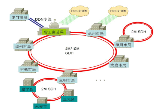 目前,某省工商總局與下轄福州、莆田、泉州、漳州、龍巖、三明、南平八市局采用4M/10M SDH專線互連,與廈門市局采用DDN專線互連,除廈門外的所有市局通過2M SDH專線連接下轄各縣區(qū)局,組建成全省范圍的工商系統(tǒng)專網。