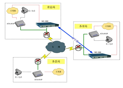 系列IP-PBX產品的靈活性,在每個市局放置一臺ME-1000型號的IP-PBX,管理市局及下屬縣區(qū)局的電話系統(tǒng);省總局放置一臺ME-1000,管理總局電話系統(tǒng);同時各市局的ME-1000向總局注冊,形成IP中繼連接,組成全省互通的IP電話管理系統(tǒng)。在終端方面,我們建議采用單端口的ATA-811P桌面型語音網關連接話機,該網關通過向IP-PBX注冊,將所有模擬話機連接到VOIP系統(tǒng)中來。