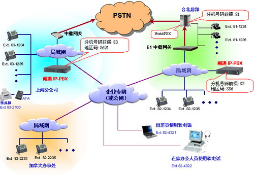 此系統(tǒng)方案不僅可以實現(xiàn)公司總部、分部、辦事處以及出差人員之間的完全免費通話和傳真,還可以實現(xiàn)在設(shè)有網(wǎng)關(guān)的各個分支機構(gòu)之間實現(xiàn)虛擬長途。例如,從上海分部撥打臺灣的客戶號碼,按照正常程序分機撥打外線電話需要先撥9+00886+客戶號碼。上海的耐通IP-PBX接到信號后發(fā)現(xiàn)目標地區(qū)設(shè)有系統(tǒng)內(nèi)部網(wǎng)關(guān),于是將呼叫經(jīng)由臺北IP-PBX及網(wǎng)關(guān),通過臺京的集團電話交換機出局接入到客戶端。而此呼叫只產(chǎn)生臺北的市話費用。公司的出差人員或者在家辦公人員也可以使用軟電話通過賓館或者家里的寬帶網(wǎng)絡(luò)接入公司的耐通網(wǎng)絡(luò)語音通信系統(tǒng),免費與總部和各分支機構(gòu)通訊,同時以市話的價格撥打總部和各分公司當?shù)氐墓潭娫捇蚴謾C。