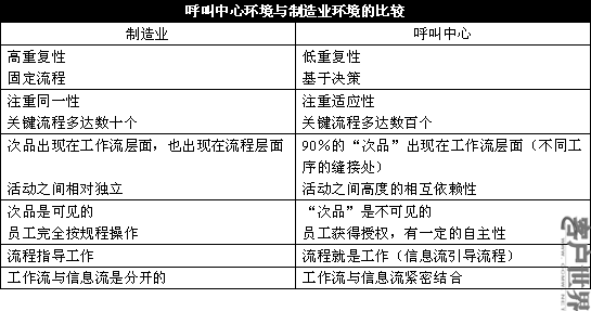 在呼叫中心的環(huán)境下,業(yè)務(wù)流程的類型主要是“Workflow”。但在流水作業(yè)的制造業(yè)環(huán)境下,“Work process”則是主要的類型。再也清楚不過(guò)了:這兩種工作現(xiàn)場(chǎng)環(huán)境是很不一樣的。
