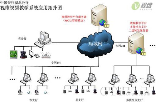 中國銀行湖北分行的視頻教學(xué)系統(tǒng)由服務(wù)器端和客戶端組成,服務(wù)器端軟件部署在省分行中心機(jī)房,配置2臺服務(wù)器,對于接受點(diǎn)超過5個的分支機(jī)構(gòu)配置二級轉(zhuǎn)發(fā)服務(wù)器,共支持全省各支行及支行內(nèi)多個客戶端同時在線,負(fù)責(zé)所有培訓(xùn)的召集、音視頻交互、加密等工作,各支行通過WEB方式即可實(shí)現(xiàn)客戶端軟件的自動安裝與升級,輕松實(shí)現(xiàn)實(shí)現(xiàn)省分行以及各支行共77余個接受點(diǎn)的高清音視頻視頻教學(xué)。同時為中國銀行湖北分行的視頻教學(xué)系統(tǒng)配置異構(gòu)兼容模塊,支持與其他視頻會議及軟、硬件視頻教學(xué)系統(tǒng)無縫融合,避免重復(fù)投資造成的浪費(fèi)。網(wǎng)絡(luò)拓?fù)鋱D如下: