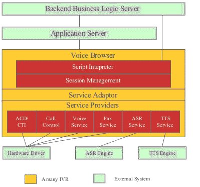 聲通技術(shù)的Amany IVR是集流程編輯環(huán)境、語法解析器和執(zhí)行平臺(tái)為一體的通用語音平臺(tái),在這基礎(chǔ)上增加了CTI中間件和TAPI/WAV等方面的技術(shù)支持,使它不僅能作為一個(gè)獨(dú)立的語音應(yīng)答系統(tǒng)使用,而且可以作為呼叫中心理想的IVR服務(wù)器,并且可以作為外撥服務(wù)器、傳真服務(wù)器、語音門戶網(wǎng)站系統(tǒng)使用,是一個(gè)具有國(guó)際先進(jìn)水平的綜合性語音平臺(tái);所有的可選功能模塊通過獨(dú)有的Plug-in技術(shù)可實(shí)現(xiàn)功能模塊動(dòng)態(tài)卸載,使客戶可以挑選自己需要的功能模塊,在將來需要的時(shí)候在配置相應(yīng)的功能模塊,使客戶成本大大降低,同可以保證將來系統(tǒng)平滑升級(jí),使用擁有更多的選擇。