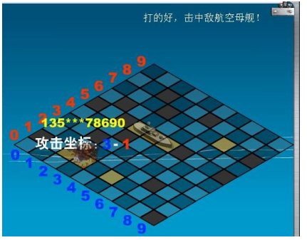 這里是游戲的主戰(zhàn)場,觀眾每發(fā)送一個(gè)轟炸坐標(biāo)過來,都會在這里有體現(xiàn)。如轟炸者的手機(jī)號、攻擊坐標(biāo)、是否擊中(擊中是一團(tuán)火光,未擊中則是水花)、及語音及文字提示。