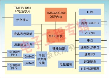 TI提供全面的VoIP解決方案,覆蓋IP電話、家庭網(wǎng)關(guān)、電信級(jí)網(wǎng)關(guān)以及VoADSL和VoCable。針對(duì)企業(yè)級(jí)IP電話需求,TI提供了多種解決方案,其中TNETV1050/TNEV1055的SoC方案基于TI的TMS320C55x DSP系列的可編程DSP和增強(qiáng)的32位MIPS內(nèi)核。它使用先進(jìn)的系統(tǒng)架構(gòu),在提供高性能低功耗的同時(shí),兼顧系統(tǒng)的可擴(kuò)展性,還包括豐富的外設(shè)接口,滿足設(shè)計(jì)企業(yè)級(jí)電話系統(tǒng)的要求。