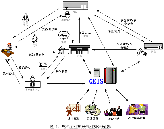 GEIS燃氣運營管理信息系統(tǒng)的應用是企業(yè)的長期發(fā)展的驅動力,它是一套以客戶服務接觸中心為龍頭、以運營生產流程管理為龍身、以經營分析為龍尾的閉環(huán)信息處理系統(tǒng)。它由客戶服務中心子系統(tǒng)、門市業(yè)務子系統(tǒng)、氣站管理子系統(tǒng)、安全搶修平臺和管理與集成模塊組成。實踐的事實告訴我們,它起到保持客戶忠誠度、提升企業(yè)品牌影響力、提高業(yè)務運作效率、加快業(yè)務經營決策和促進企業(yè)持續(xù)發(fā)展的作用。