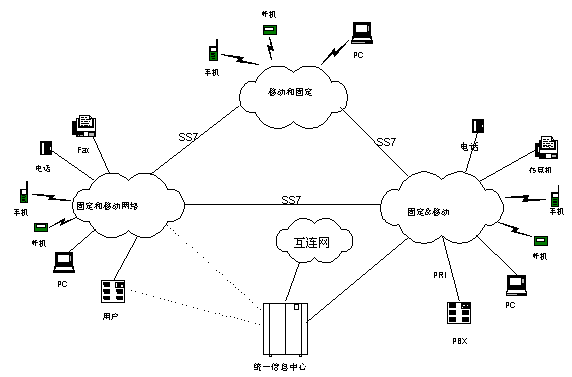 例如,用戶可以通過手機聯(lián)入UMS統(tǒng)一信息系統(tǒng)中,查取自己的電子郵件;同樣,當用戶的語音信箱中有新內容時,用戶也可以告知UMS通過呼機來通知自己;用戶也可以在PC機上接收和發(fā)送傳真信件,等等。