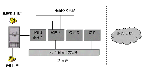 在PC機平臺內(nèi),可插入三種不同類型的語音卡,中繼卡用于連接企業(yè)原有的用戶交換機,使得分機用戶可以通過IP網(wǎng)絡接打電話,中繼線可采用模擬線或數(shù)字中繼線、座席卡用于直接連接電話用戶,常用于沒有用戶交換機的場合;傳真卡用于完成IP網(wǎng)絡上的傳真中繼功能。所有的語音卡之間采用卡間交換總線相連,以便實現(xiàn)互相通話和傳真資源共享。PC平臺內(nèi)一般還需要網(wǎng)卡實現(xiàn)與INTERNET的連接。網(wǎng)關軟件是該IP網(wǎng)關的關鍵部分,完成對語音卡的控制和IP協(xié)議處理。