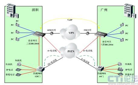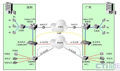 A公司總部設在深圳,在廣州有分公司。深圳總部目前已有10M光纖到樓作為總出口帶寬,已安裝1臺支持VPN功能的Linksys路由器;語音方面,已申請了16條電話線,并安裝1臺國威128門PBX;廣州也引入了3M光纖作為出口帶寬,和6條電話線作為PSTN外線,已安裝1臺支持VPN功能的Linksys路由器和1臺國威64門PBX。深圳、廣州兩地公司已建立了VPN隧道,以提供有安全保障的數(shù)據(jù)網(wǎng)絡平臺。