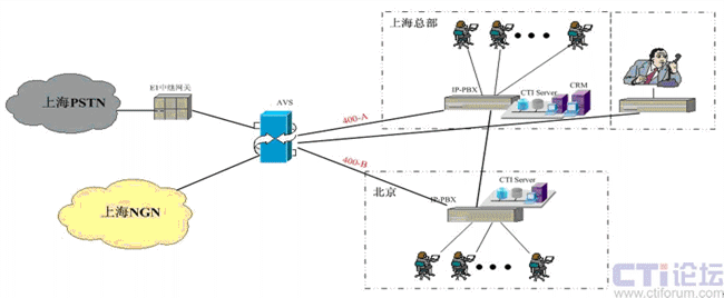 在上海采用傲威通信的AVS軟交換平臺(tái)實(shí)現(xiàn)VoIP呼叫系統(tǒng)的主叫識(shí)別,決定呼叫路由的選定。在上海和北京分別建設(shè)IP-PBX和CTI呼叫系統(tǒng),在各辦事處或分公司可根據(jù)選擇是否要建設(shè)坐席或普通電話系統(tǒng),所有節(jié)點(diǎn)的呼入呼出統(tǒng)一從上海出口實(shí)現(xiàn)出入。