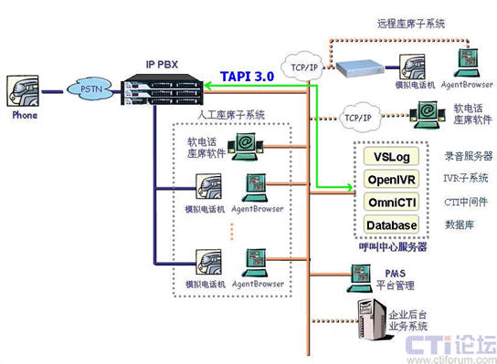 那么如何利用TAPI技術構建現(xiàn)代呼叫中心呢?傳統(tǒng)呼叫中心的做法是每個坐席配一部電話。而采用TAPI 3.0技術,完全不需要每個座席再配一部電話,我們只需一臺電腦終端,配以PC麥克風和耳機即可為客戶服務,因為當普通電話呼叫轉到座席時,語音是經過轉換壓縮為IP包進行收發(fā)的。我們可以利用TAPI技術提供的全套API標準函數來控制CTI的硬件,包括IPPBX或者板卡,來實現(xiàn)這種模式的呼叫中心,并且實現(xiàn)簡單,比較適合在原有系統(tǒng)上的升級換代。