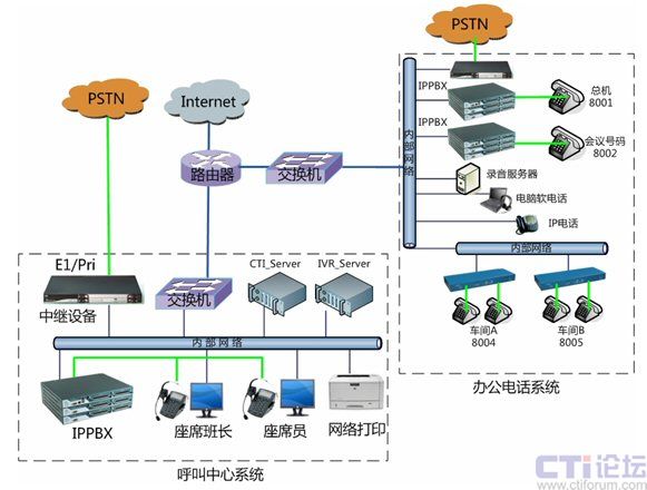 化。在總部核心機房將電話外線中繼接口與中繼網(wǎng)關(guān)設(shè)備連接,并通過內(nèi)部網(wǎng)絡(luò)對接到IPPBX,分別應(yīng)用于辦公電話系統(tǒng)和公司呼叫中心系統(tǒng)。設(shè)備用于公司辦公電話和公司會議系統(tǒng),可最大支持到30方會議,或多個小型獨立會議系統(tǒng)。各個不同的車間可以采用電話線之間接入分機,或采用傲威AVG800的網(wǎng)關(guān)通過網(wǎng)絡(luò)接入,并注冊到IPPBX系統(tǒng)實現(xiàn)內(nèi)網(wǎng)網(wǎng)絡(luò)分機。對將來的分公司的辦公電話系統(tǒng),將不再使用傳統(tǒng)的PBX設(shè)備,而是直接利用IPPBX系統(tǒng),通過IP