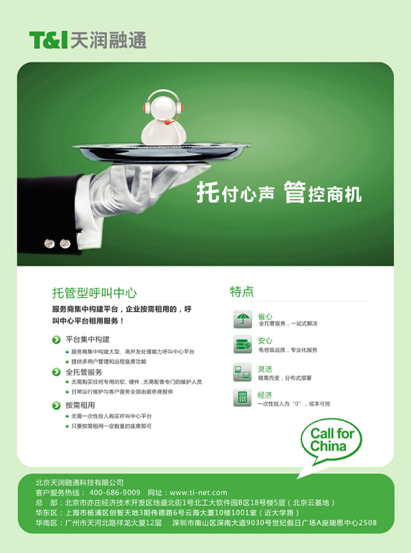 北京天潤(rùn)融通科技有限公司致力于為企業(yè)提供簡(jiǎn)單、易用、可依靠的托管型呼叫中心服務(wù),幫助企業(yè)更好地經(jīng)營(yíng)其客戶(hù)資源。天潤(rùn)融通是國(guó)內(nèi)呼叫中心領(lǐng)域內(nèi)領(lǐng)先的“云應(yīng)用”提供者。先后承接了百度全國(guó)客服中心、平安保險(xiǎn)北京客服中心、慧聰網(wǎng)呼叫中心、央視網(wǎng)絡(luò)客服中心、安博教育客服中心、圓通快遞客戶(hù)服務(wù)中心、飯統(tǒng)網(wǎng)客戶(hù)訂餐中心等大型的呼叫中心項(xiàng)目。服務(wù)的客戶(hù)遍及互聯(lián)網(wǎng)、教育培訓(xùn)、金融服務(wù)、旅游票務(wù)、電子商務(wù)、食品飲料、醫(yī)療保健、消費(fèi)品制造和銷(xiāo)售、物流、餐飲娛樂(lè)、電視購(gòu)物等十多個(gè)領(lǐng)域達(dá)數(shù)千家企業(yè)客戶(hù)。