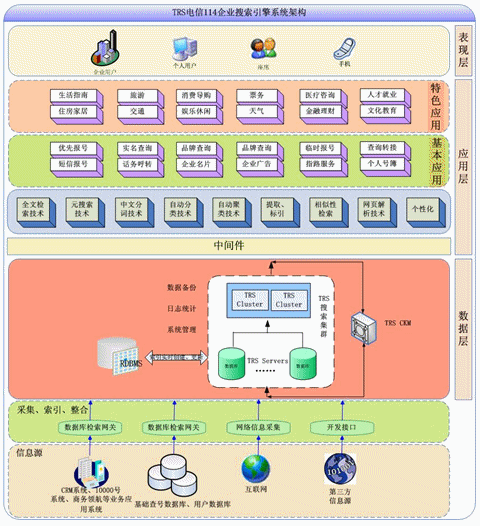 TRS公司結(jié)合電信行業(yè)114業(yè)務(wù)應(yīng)用需求,依托自身企業(yè)搜索引擎產(chǎn)品和中文信息處理技術(shù),推出的的電信114企業(yè)搜索引擎解決方案,能夠全面整合索引搜索電信114業(yè)務(wù)應(yīng)用的信息內(nèi)容,并向用戶提供高效的、準(zhǔn)確的、安全的、個性化的搜索體驗。其框架圖如下: