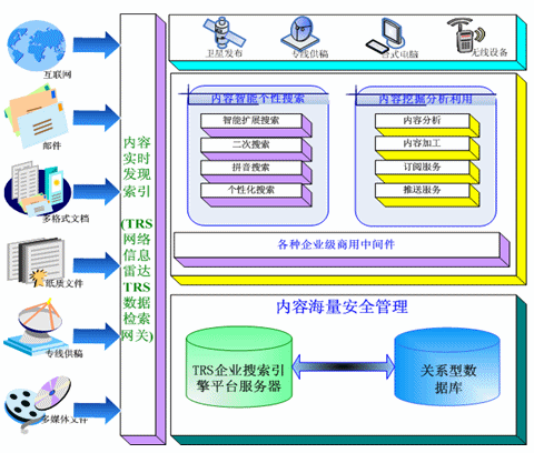 TRS公司推出的企業(yè)搜索引擎解決方案,利用TRS公司多年來自主開發(fā)的TRS Database Server作為企業(yè)搜索引擎服務(wù)的平臺?梢詫㈦娦牌髽I(yè)內(nèi)外部多種格式、多種介質(zhì)形態(tài)、多種存儲方式的內(nèi)容信息,以實時的方式將這些信息進行索引。并且在索引的過程中力求能夠做到準(zhǔn)確,并配合以相關(guān)智能語言技術(shù)做信息的去重、自動標(biāo)引等能力。其框架如圖: