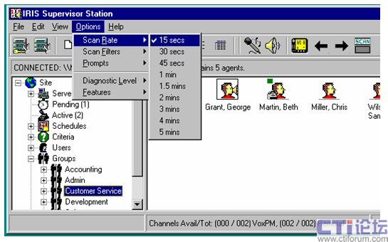 同時IRIS還可對座席工作的狀態(tài)進(jìn)行分組實(shí)時監(jiān)控或監(jiān)聽、可直觀的了解的座席的狀態(tài)(離席、入席、電話中、電話待命中、已規(guī)劃中);可對座席人員進(jìn)行人員跟蹤的實(shí)時監(jiān)聽。