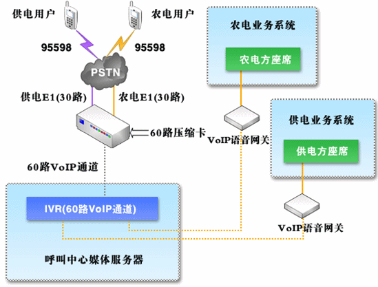 由于要保證供、農(nóng)電統(tǒng)一95598號碼的接入,呼叫中心系統(tǒng)采用供、農(nóng)電合一的方式,建立統(tǒng)一的呼叫中心系統(tǒng),并保證系統(tǒng)接入容量及其他資源能夠滿足統(tǒng)一的要求;在自動語音菜單中,分別設立供、農(nóng)電用戶層,用戶可以自行區(qū)分、選擇進入相應的導航菜單中,確認之后,系統(tǒng)默認記錄該用戶的類型,再次呼叫時,系統(tǒng)自動識別該用戶供、農(nóng)電類型;在確認了用戶類型之后,用戶選擇轉接人工座席時,自動進入相應的供電座席組或者農(nóng)電座席組,并且,在確定轉接錯誤分組之后,可以由座席進行再次轉接。