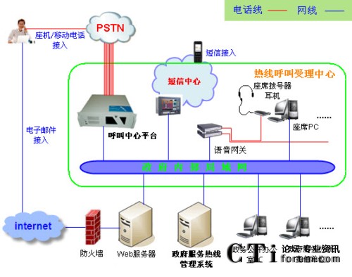 - 公民座機和移動電話通過當(dāng)?shù)仉娦诺腜STN網(wǎng)絡(luò)接入呼叫中心平臺,然后進入熱線系統(tǒng);