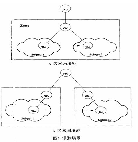 H.323定義中,區(qū)域指由H.323實(shí)體(終端、ITG、MCU)組成的集合,并由一個網(wǎng)守進(jìn)行管理。每一個區(qū)域只有一個網(wǎng)守,但允許多個子網(wǎng)通過路由器連接進(jìn)來。對于這種多子網(wǎng)單網(wǎng)守的特性,我們發(fā)現(xiàn)這與GSM系統(tǒng)中的服務(wù)區(qū)類似,網(wǎng)守就相關(guān)于HLR或者VLR。服務(wù)區(qū)中有移動電話終端和代理管理下的基站,類似的一個區(qū)域中有多個子網(wǎng)并都在一個網(wǎng)守的管理下。當(dāng)移動IP電話從一個子網(wǎng)漫游到另外一個子網(wǎng)時,IP電話的IP地址就發(fā)生了變化。如果不做移交處理的話,連接將中斷。