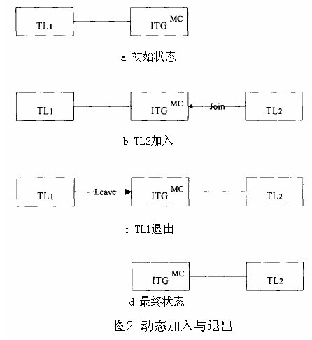 hoc多點(diǎn)會議的動態(tài)加入與退出是等價的。圖3(a)說明了ITG與TL1通信時的漫游。圖2(b)說明了子網(wǎng)1向子網(wǎng)2的移交處理。圖2(c)說明了在移交處理結(jié)束后ITG與TL1連接的中斷。最后,移交處理成功完成,只剩下ITG與TL2的連接,如圖2(d)所示。