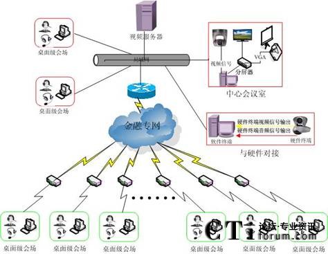 根據(jù)上圖可以知道,在全南縣信用社中心機(jī)房部署一臺(tái)視頻服務(wù)器,這臺(tái)視頻服務(wù)器主要提供各個(gè)會(huì)場(chǎng)進(jìn)行召開(kāi)會(huì)議訪(fǎng)問(wèn),同時(shí)提供遠(yuǎn)程對(duì)系統(tǒng)管理和維護(hù)功能;在全南縣信用社硬件視頻會(huì)議室部署一臺(tái)帶有采集卡PC主機(jī),這臺(tái)PC用和硬件視頻會(huì)議對(duì)接,由硬件視頻會(huì)議提供一路視頻和一路音頻輸出信號(hào),再把硬件提供輸出視頻信號(hào)接入PC主機(jī)上采集卡上,輸出音頻信號(hào)接入PC主機(jī)聲卡麥克風(fēng)上,這樣只要開(kāi)會(huì)是把這臺(tái)PC主機(jī)訪(fǎng)問(wèn)視頻服務(wù)器登錄會(huì)議室其它會(huì)場(chǎng)就可以收聽(tīng)收看到硬件視頻會(huì)議會(huì)內(nèi)容。其它各個(gè)支行和網(wǎng)點(diǎn)會(huì)場(chǎng)通過(guò)金融專(zhuān)網(wǎng)訪(fǎng)問(wèn)視頻服務(wù)器,就可以參加會(huì)議、培訓(xùn)、討論交流問(wèn)題等功能。
