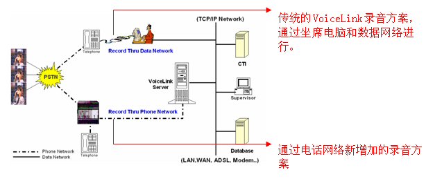 Voicelink 監(jiān)控錄音方案完全適應(yīng)現(xiàn)代呼叫中心的環(huán)境。Voicelink能有效的節(jié)約成本,它不需要專用硬件,能有效的利用包括座席計(jì)算機(jī)和網(wǎng)絡(luò)等公司的現(xiàn)有資源來進(jìn)行日常電話錄音。但考慮到有些呼叫環(huán)境只有涉及到電話呼入和呼出,也不用跟業(yè)務(wù)應(yīng)用或后臺數(shù)據(jù)(如證券交易平臺)交互,現(xiàn)在,Voicelink增加了錄音方式來提高解決方案的能力,該錄音方式是通過電話網(wǎng)絡(luò)來錄音的,該新增加的錄音方式完全獨(dú)立于計(jì)算機(jī)和數(shù)據(jù)網(wǎng)絡(luò)。下圖顯示Voicelink提供不同的方式,形成一個單一的錄音平臺。