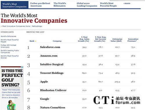 CTI論壇(ctiforum)8月15日消息(記者 張潔):2011年7月,由美國(guó)知名財(cái)經(jīng)雜志《福布斯》評(píng)選出的全球百大最具創(chuàng)新能力企業(yè)排行榜上,salesforce.com超越Facebook、蘋果、亞馬遜等知名企業(yè)位列第一。