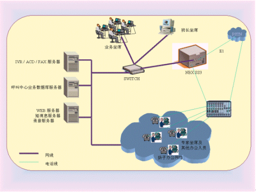 根據揚子晚報目前現有條件,采取全面整合、多層面集成、總體規(guī)劃、模塊化設計的設計思想,利用3Com NBX SS3 網絡電話交換機作為基礎通信平臺,由北大方正電子技術有限公司在北京網音公司呼叫中心中間件進行集成開發(fā),建立CTI,ACD、IVR、FAX、TTS及其應用服務,集成現有的WEB、mail、短消息系統,建立統一消息平臺,新建和利用各業(yè)務數據庫,設計業(yè)務坐席及客戶端軟件。