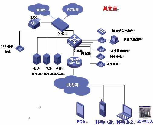 北京市交通應急指揮中心,此次項目采用了1500個設備容量的華為3Com V3000 NBX系統(tǒng)一臺為核心語音調(diào)度交換機,連接PSTN網(wǎng)。使用3101標準版IP智能話機、3102商務版IP智能話機和3105話務臺總數(shù)量達到了34部。在已有的網(wǎng)絡結構中實施語音系統(tǒng),減少對網(wǎng)絡基礎設施的投資,節(jié)省話路設備成本、電話系統(tǒng)安裝、維護和使用管理,還可提供更多的通信業(yè)務和更強的智能語音功能。結構圖如下: