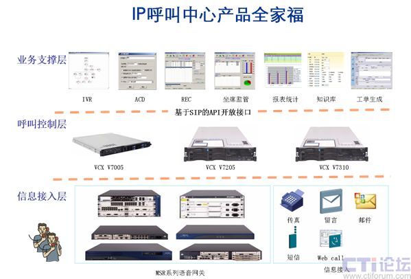 3、“信息接入層”通過(guò)PSTN(MSR)、短信、郵件、留言、WEB CALL等信息通訊手段,使傳統(tǒng)的語(yǔ)音呼叫中心便捷的擴(kuò)展為多媒體的呼叫中心。
