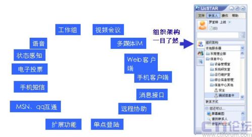 UcSTAR :Unified Communication Star,是深圳市擎旗信息技術(shù)有限公司推出的企業(yè)級融合通信平臺。是融合多種通訊手段(IM、文件、視頻、語音、EMAIL、SMS、電話、VOIP、MSN/QQ互通),融合企業(yè)的多種應(yīng)用系統(tǒng)緊密集成(OA、CMS、ERP、EIP、Portal、網(wǎng)站、應(yīng)用軟件),交流對象和交流內(nèi)容可管理,可控制,可擴展,輕松實現(xiàn)部署企業(yè)的統(tǒng)一工作平臺。 UcSTAR能統(tǒng)一消息、統(tǒng)一溝通、統(tǒng)一管理、隨意選擇多種溝通手段,深航一直在找這樣的一種產(chǎn)品,公司信息部門從上到下給予極高的重視,商務(wù)的過程也都開了綠燈,一路順暢。