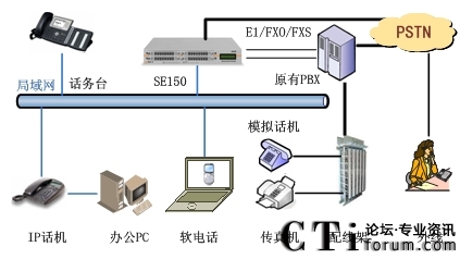 此方案適用于已經(jīng)部署了傳統(tǒng)PBX的企業(yè)。要求企業(yè)部署好數(shù)據(jù)網(wǎng)絡(luò),如果采用模擬終端,則企業(yè)的各個(gè)辦公點(diǎn)需要先將網(wǎng)絡(luò)線(xiàn)路和電話(huà)線(xiàn)路部署到位,同時(shí)企業(yè)原有的PBX要預(yù)留與SE150對(duì)接的接口。